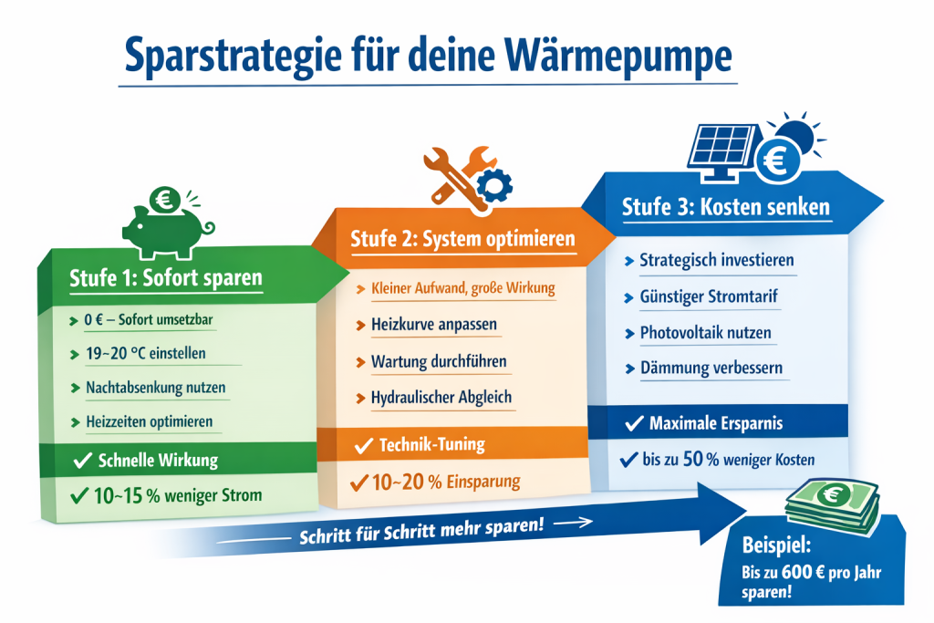 Wenn du den Stromverbrauch deiner Wärmepumpe wirklich spürbar senken willst, brauchst du keine komplizierte Technik – sondern eine klare, umsetzbare Strategie. Entscheidend ist die richtige Reihenfolge: erst die schnellen Gewinne mitnehmen, dann langfristig optimieren.